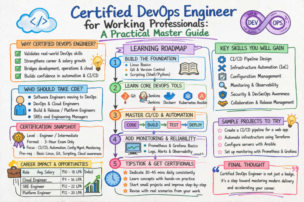 This guide is written for software engineers, DevOps practitioners, cloud professionals, and team leaders who want to understand the purpose, value, difficulty, sequence, and career impact of the Certified DevOps Engineer path. It also connects this certification to broader career tracks such as DevSecOps, SRE, AIOps, MLOps, DataOps, and FinOps, which appear in DevOpsSchool’s broader certification ecosystem.